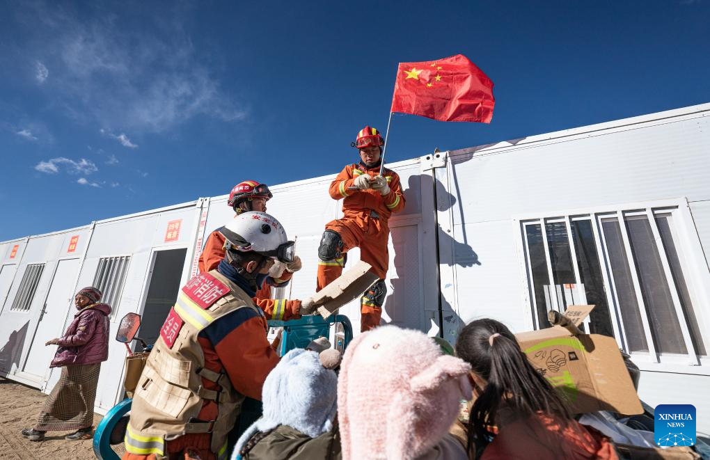 A firefighter prepares to erect a national flag on a makeshift shelter in Yejiang village of Dingri county in Shigatse, Southwest China's Xizang autonomous region, Jan 13, 2025. [Photo/Xinhua]
