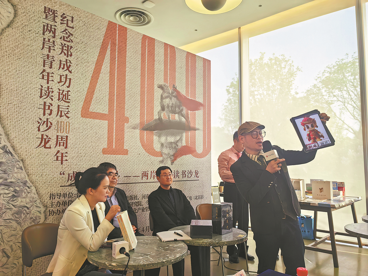 Hsueh Ying-tung (right) displays the cartoon character he created of Zheng Chenggong at an event to commemorate the 400th anniversary of Zheng's birth in Beijing last year. [Photo provided to China Daily]