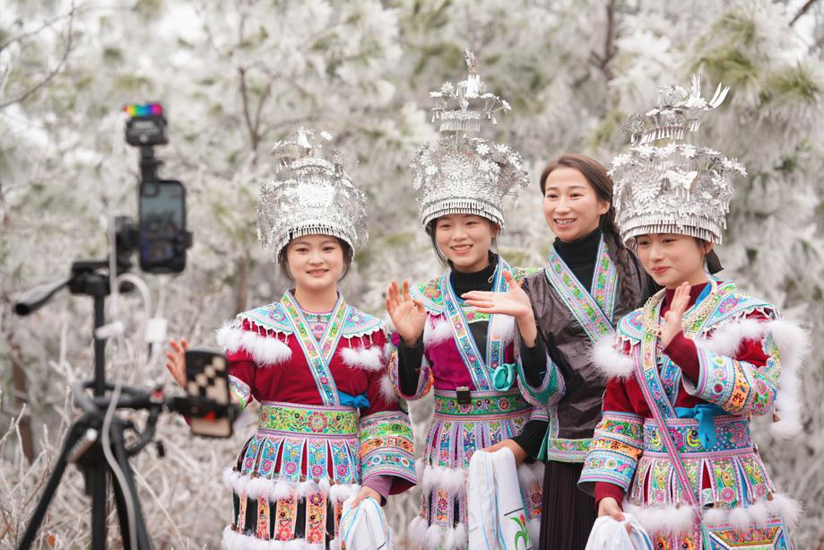 Snow-dusted peaks, a sea of clouds and wind turbines composed a breathtaking vista. Locals adorned in traditional Miao attire played the lusheng, a traditional Chinese reed instrument, while livestreaming the snowy spectacle.