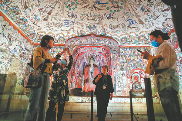 Lou Jie (second from right), a researcher with the Dunhuang Academy, introduces a replica of a Mogao Cave to visitors at a preview of the Beyond the Bounds of History exhibition in Beijing's Palace Museum on Sept 16. [Photo by Jiang Dong/China Daily]