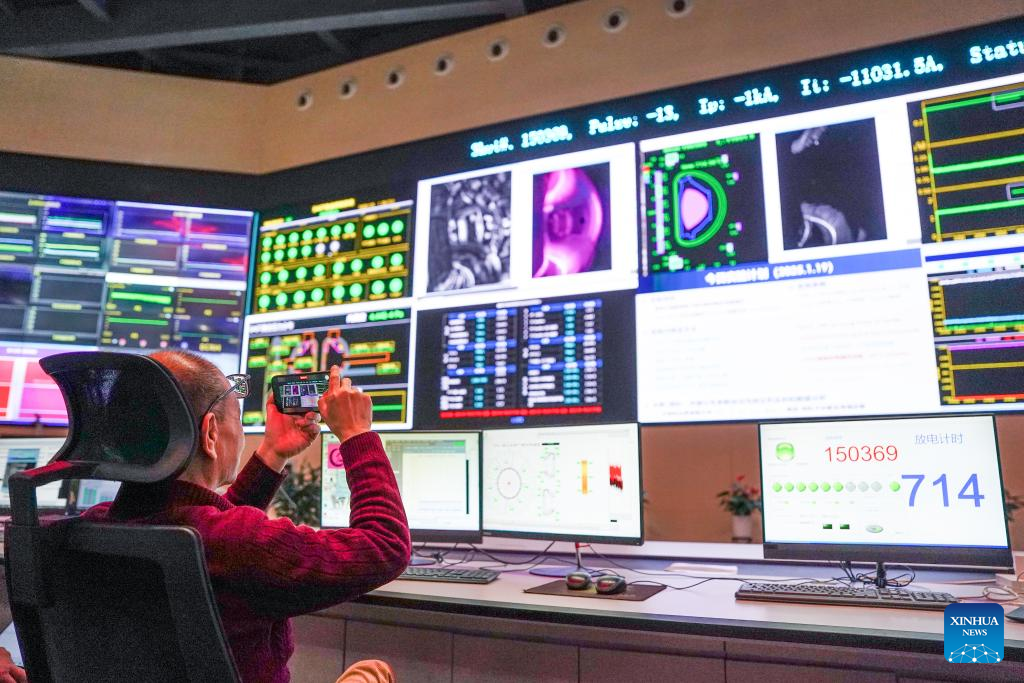 Gong Xianzu, head of division of the Experimental Advanced Superconducting Tokamak Physics and Experimental Operations, observes data during an experiment in Hefei, East China's Anhui province, Jan 19, 2025. [Photo/Xinhua]