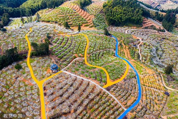 Plum flowers are in full bloom in a village in Ningde city, Fujian province on Feb 28, 2023. [Photo/VCG]