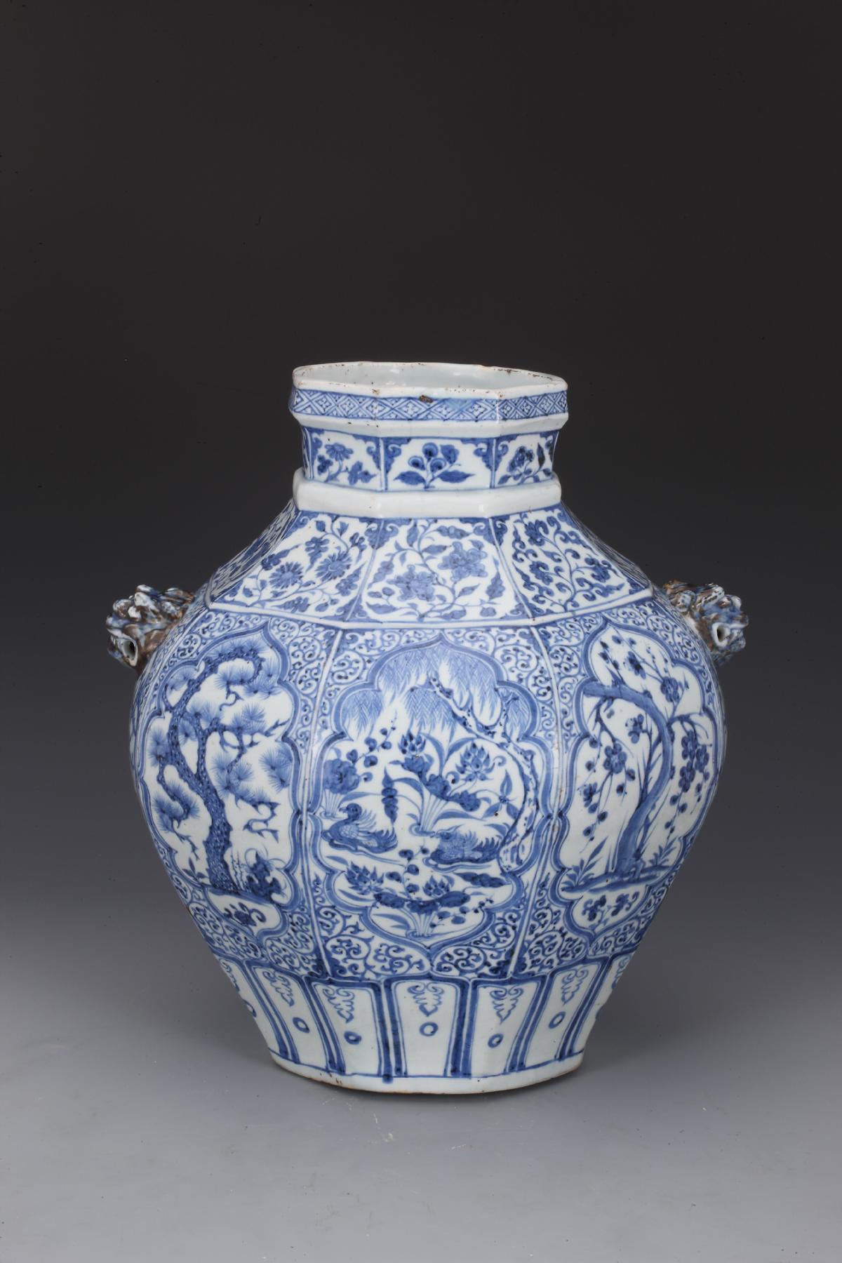 Check out the beauty of this rare Yuan Dynasty (1271-1368) octagonal blue-and-white jar! On its body with motifs of interlocking plants as background, eight reserved panels respectively showcase scenes of lotus ponds, pine trees, bamboo and plum blossoms. The reserved panels on the neck depict various flower branches and plum blossoms. The decorations on the jar exude a profound artistic expression. Collection: Liaoning Provincial Museum.