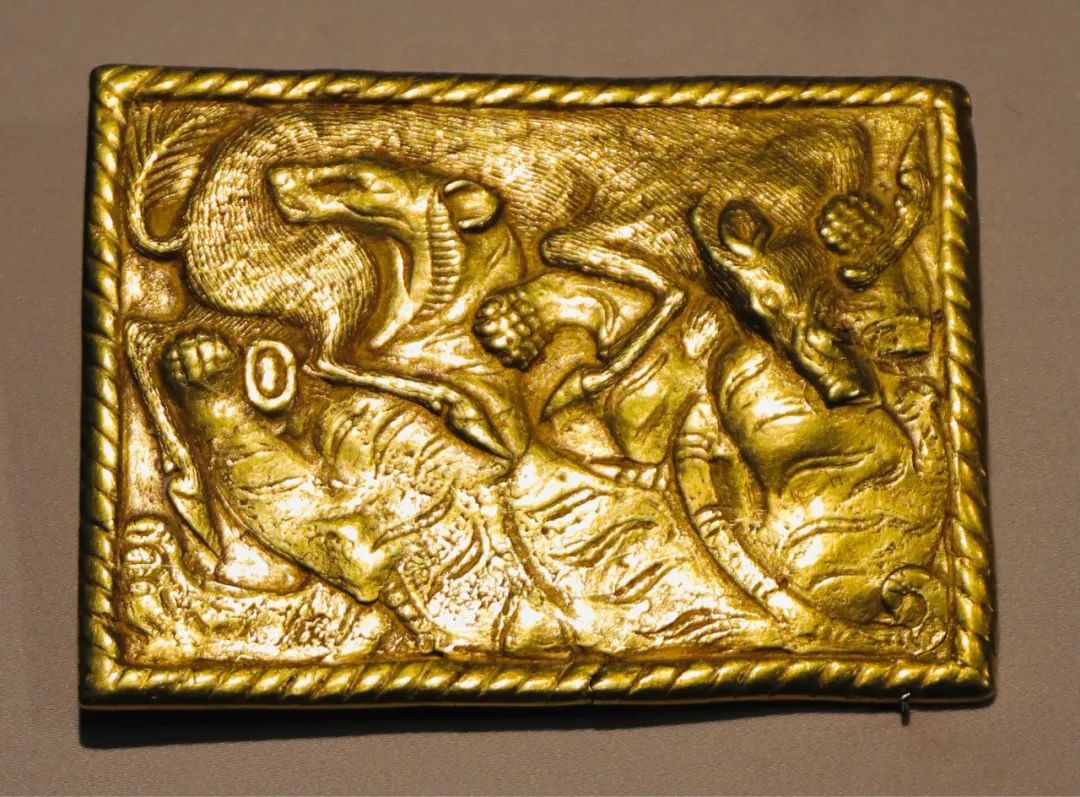 Gold plaque with patterns of tiger and pig fighting each other [Photo/Official WeChat account of the Sanxingdui Museum]
