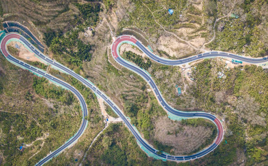An aerial drone photo shows a section of a scenic ring road surrounding the National Park of Hainan Tropical Rainforest in Baoting, South China's Hainan province, Jan 30, 2025. Hainan has constructed two scenic loop highways, one along the coast and the other around the mountains, making it more convenient for visitors to enjoy the island's natural beauty. [Photo/Xinhua]