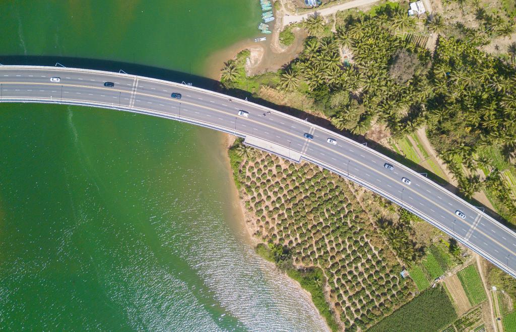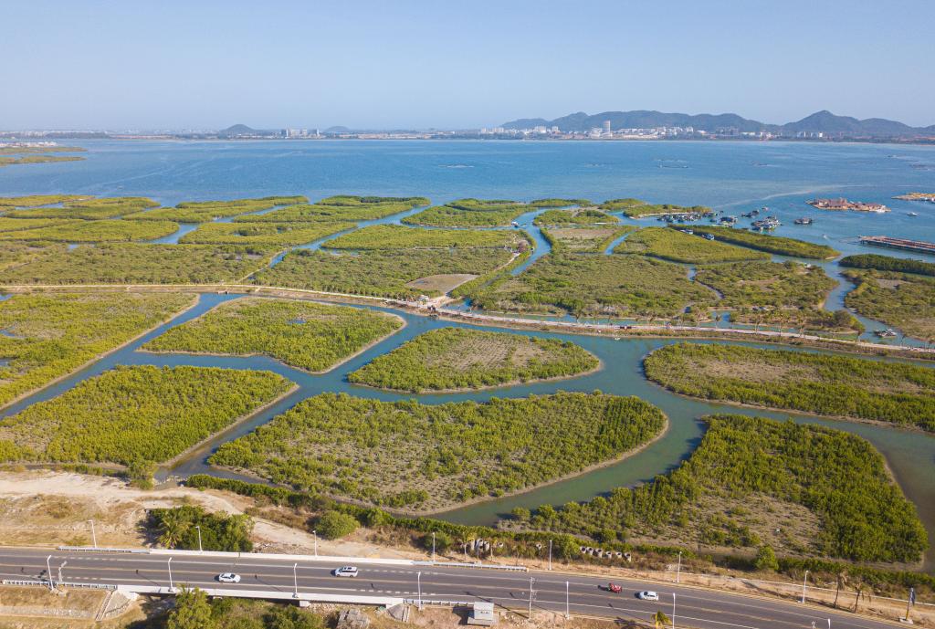 An aerial drone photo shows a section of Hainan Coastal Scenic Highway by the Hainan Lingshui Mangrove National Wetland Park in South China's Hainan province, Jan 31, 2025. Hainan has constructed two scenic loop highways, one along the coast and the other around the mountains, making it more convenient for visitors to enjoy the island's natural beauty. [Photo/Xinhua]