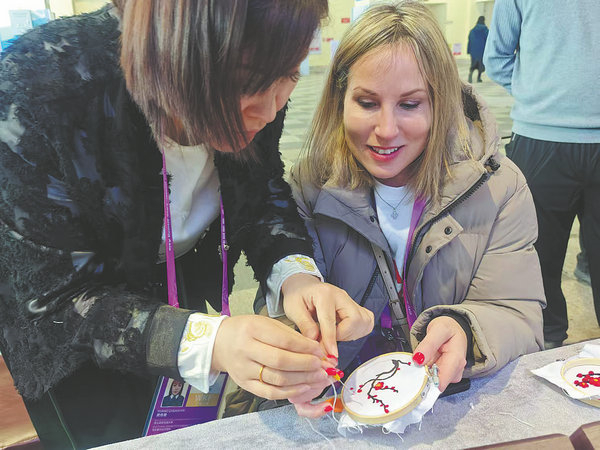 A guest learns traditional Chinese embroidery. [Photo by Wei Xiaohao/China Daily]