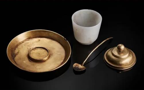 Jade cup with a gold lid, gold saucer and gold teaspoon, Ming Dynasty, from the collection of Nanjing Museum [Photo/Official WeChat account of Nanjing Museum]
