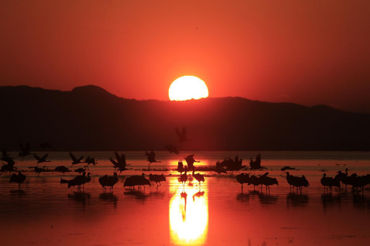 Rare birds take flight with the rising sun at Caohai National Nature Reserve in Bijie, Guizhou province. [Photo by Shen Guangyong and Yue Gang/For chinadaily.com.cn]