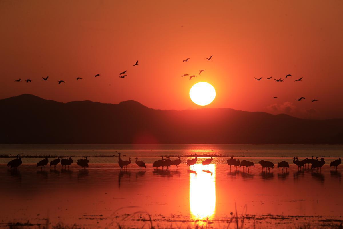 Rare birds take flight with the rising sun at Caohai National Nature Reserve in Bijie, Guizhou province. [Photo by Shen Guangyong and Yue Gang/For chinadaily.com.cn]