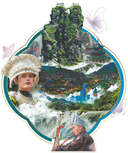 From top: Fanjing Mountain in Guizhou province, with an elevation of 2,572 meters, offers breathtaking vista. Baojing Dong village has a history of 360 years. Built in early Ming Dynasty, Zhenjiang Pavilion is a landmark of Zhenyuan Ancient Town. Xijiang Qianhu Miao Village is where culture and nature intertwine. A sprawling urban wetland is at the heart of the Guanshanhu Park in Guiyang. The magnificent Huangguoshu Waterfall is iconic in the province. A performer in Congjiang county. Left: A girl of Miao ethnic group in Congjiang. LIU YAN/LIU HONGTAO/YANG TAO/WU DEJUN/FOR CHINA DAILY