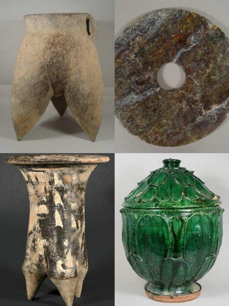These items, spanning from the Neolithic period to the Qing Dynasty (1644-1911), include a bronze money tree, pottery li, bronze zun, and pottery figurines, representing various categories like pottery, jade, bronze, and Buddhist artifacts.