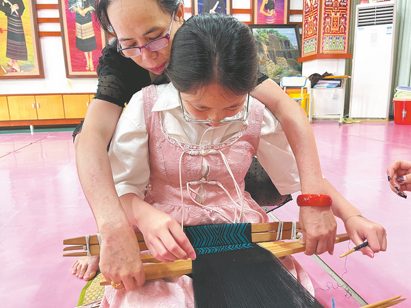 Students from Donghua University learn about Li brocade craftsmanship in Hainan province. CHINA DAILY