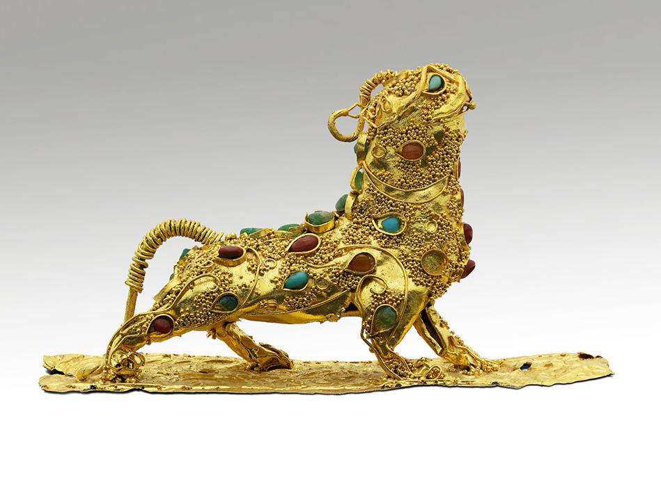 The two majestic Eastern Han Dynasty (25-220) mythical creatures are guardian beasts made using intricate metalwork techniques like filigree, welding and winding. Their golden bodies glow with inlaid red agate, turquoise and tiny gold granules – a true masterpiece of ancient craftsmanship.