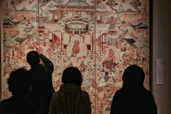 Artifacts from Gansu province, formerly a significant meeting point of Eastern and Western cultures along the ancient Silk Road, and paintings inspired by Dunhuang murals replicated by modern artists. [Photo by Jiang Dong/China Daily]