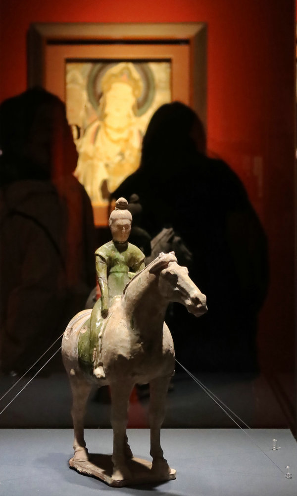 Artifacts from Gansu province, formerly a significant meeting point of Eastern and Western cultures along the ancient Silk Road, and paintings inspired by Dunhuang murals replicated by modern artists. [Photo by Jiang Dong/China Daily]