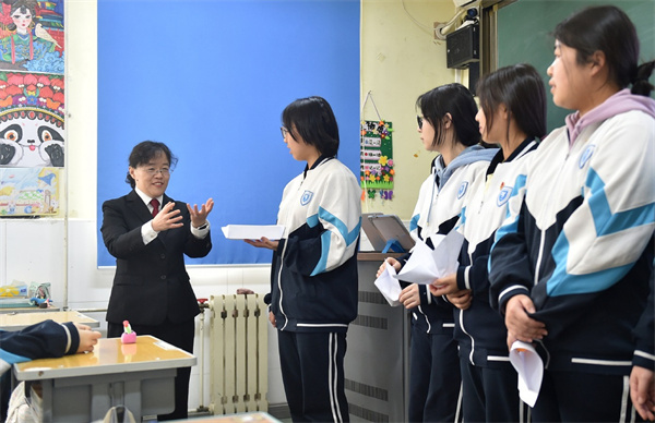 Cao Xiaoying (1st L), a judge with the People's Court of Haidian district of Beijing, talks with students during a lecture on laws at Beijing Information Management School in Beijing, March 7, 2025. [Photo/Xinhua]