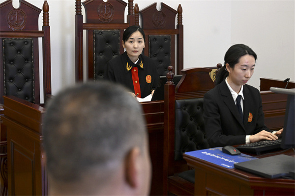 Kong Dehan (L), a judge with the People's Court of Haidian district of Beijing, processes a case at the People's Court of Haidian district in Beijing, March 6, 2025. [Photo/Xinhua]