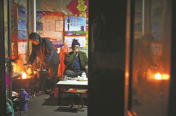 After a day's work, Wang Zizhong (right) prepares to eat his dinner at home on March 10. ZHAO DONGSHAN/CHEN MING/FOR CHINA DAILY