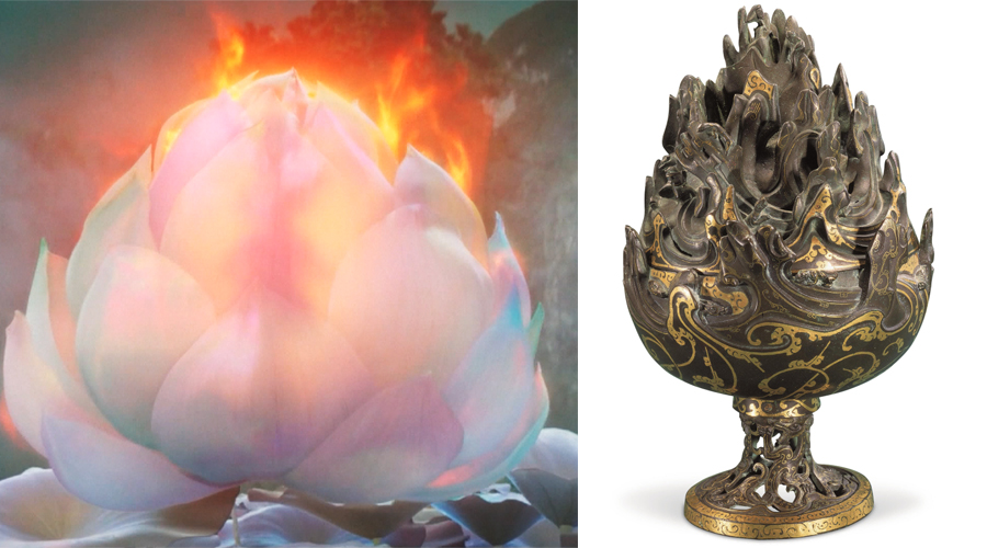 In Ne Zha 2, the seven-colored lotus, a multilayered lotus root, plays a pivotal role in reconstructing the bodies of the protagonists, Ne Zha and Ao Bing. This fantastical concept is inspired by the Boshan censer, a 2,000-year-old gilt-bronze incense burner housed at the Hebei Museum in Shijiazhuang, Hebei province.