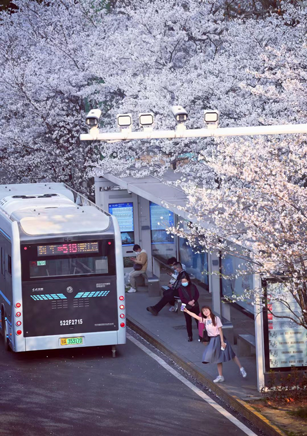 As of March 10, the bus stop has been upgraded. The extended platform now offers a more convenient and comfortable experience for flower viewing and waiting for the bus. Now passengers can enjoy the "clouds of cherry blossoms" overhead.
