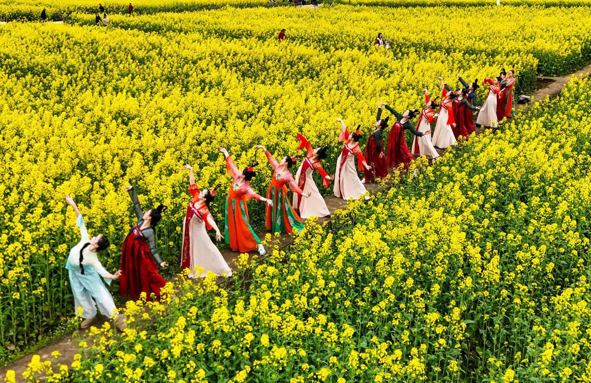 hanfu (traditional Chinese attire) fashion show in a rapeseed field during an ongoing rapeseed blossom festival in Muba township, Peng'an county, Sichuan province. [Photo by Wang Zemin/For chinadaily.com.cn]