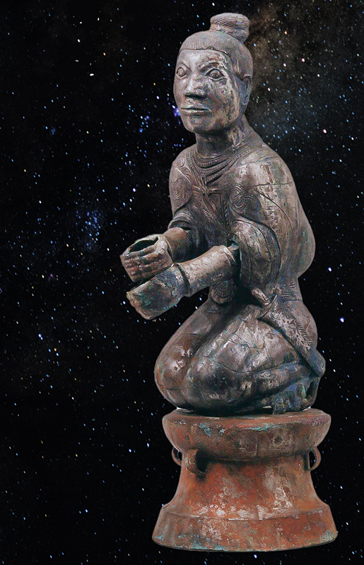 This Western Han Dynasty (206 BC-AD 24) bronze figurine wears a short cloak and should have held an umbrella. A coiled snake is seen on each side of his chest strap, facing each other with open mouth.