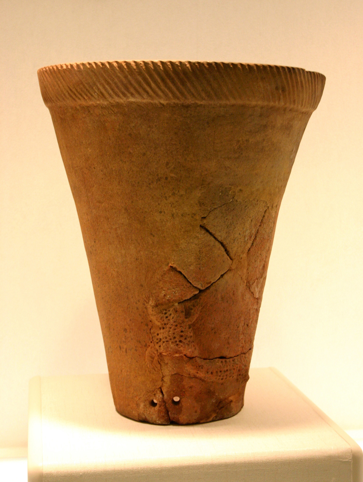 This cylindrical pottery jar, dating back 8,000 years, was made from sand-tempered red clay. It features two symmetrical raised toad motifs. Beneath one toad, a long snake appears to bite the toad's leg. As toads have strong reproductive abilities, the motifs reflect ancient people's reverence for nature and their hopeful wishes for fertility and survival.