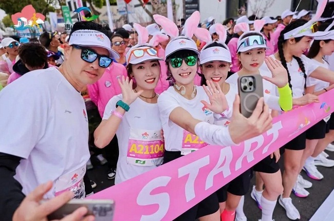 Accompanied by the Olympic long-distance running champion Wang Junxia, the participants ran into the picturesque countryside featuring blooming peach blossoms.