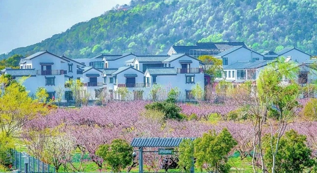 The countryside of Yangshan town is covered with blooming peach blossoms this spring. [Photo provided to wuxi.gov.cn]