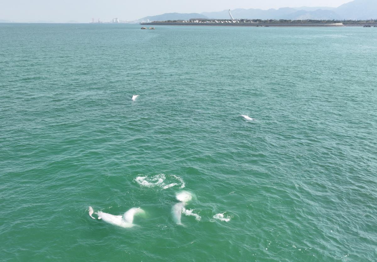 A group of Chinese white dolphins was recently spotted frolicking in the waters near the Double Happiness Island in Zhangzhou Development Zone, Zhangzhou, Fujian province. [Photo by Qiu Xiaohua/For chinadaily.com.cn]