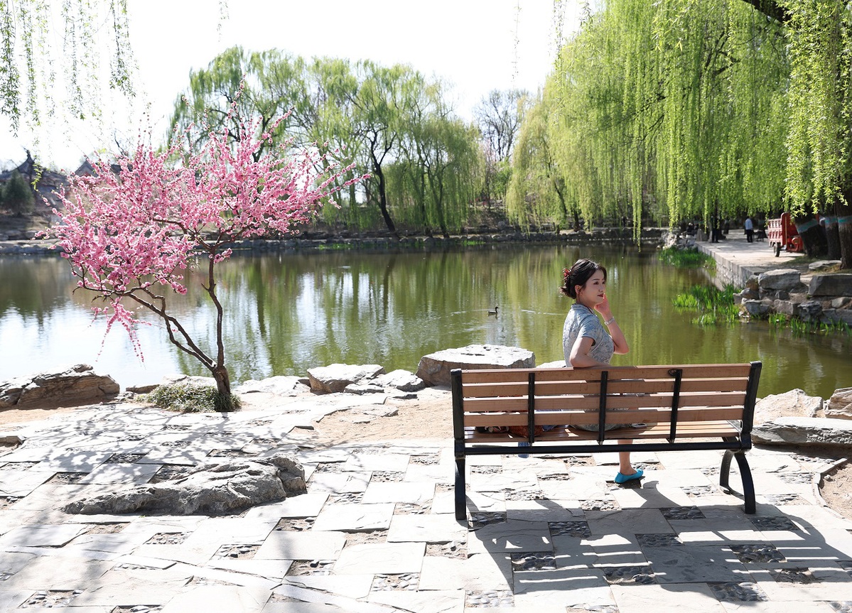 A tourist poses for photos at Yuanmingyuan Park in Beijing, April 2, 2025. [Photo by Zou Hong/chinadaily.com.cn]