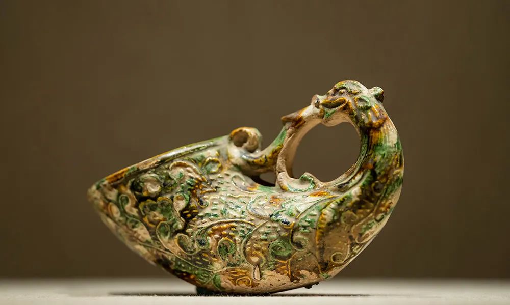 This exquisite Tang Dynasty (618-907) tri-color horn-shaped cup looks like a graceful green peacock – the raised tip like its crown, a flower branch in its beak forming the handle. Its curved body is decorated with yellow, green and white glazes and floral scroll motifs.
