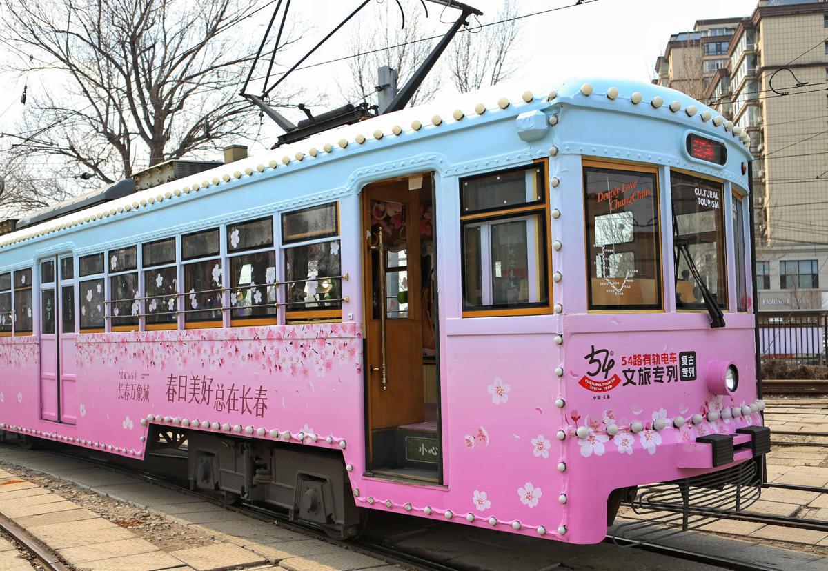 The No 54 spring-themed tramcar in Changchun, Jilin province, attracts passengers to take photos. [Photo by Jilin Daily/For chinadaily.com.cn]