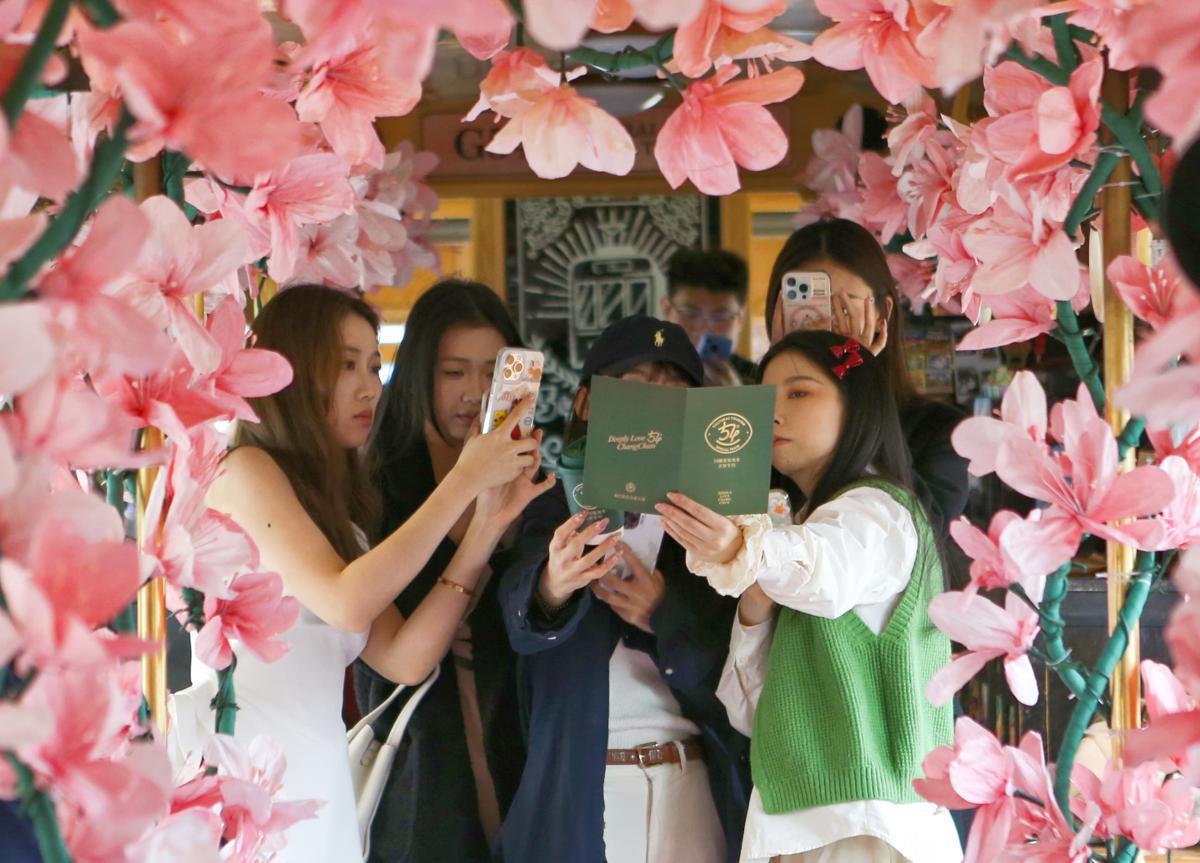The No 54 spring-themed tramcar in Changchun, Jilin province, attracts passengers to take photos. [Photo by Jilin Daily/For chinadaily.com.cn]