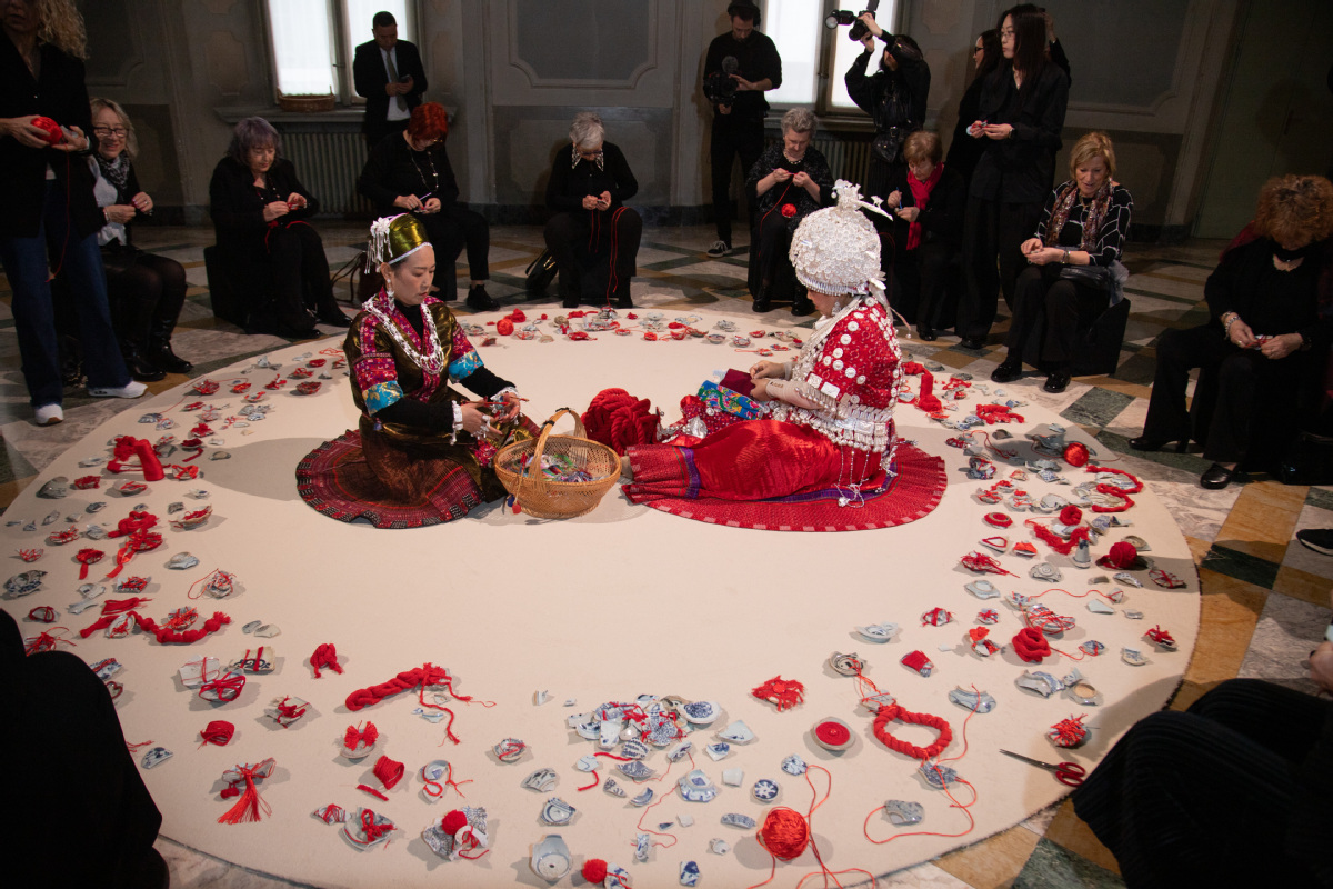 Alongside the runway show, a workshop that combines Miao embroidery with art therapy also captured attention. Miao embroidery inheritors Long Luying and Long Ting, together with Chinese artist Yuan Yuan and Le Sciure, a Milan-based social welfare group for elderly women, wove red threads onto fragments of ancient Chinese ceramics.
