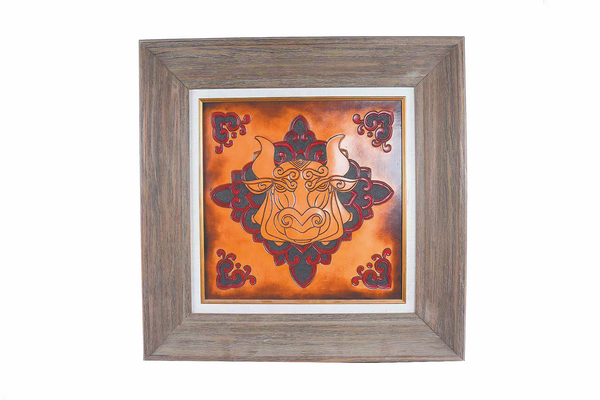 A leather-carved painting featuring a bull head pattern. CHINA DAILY