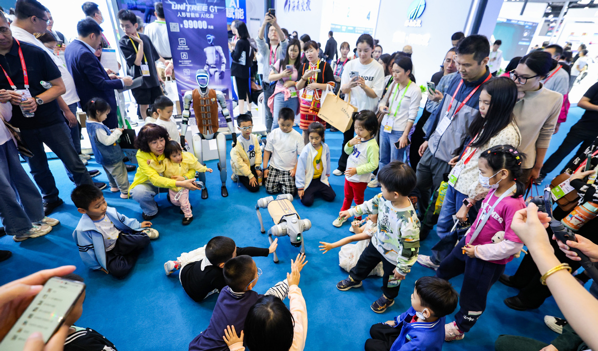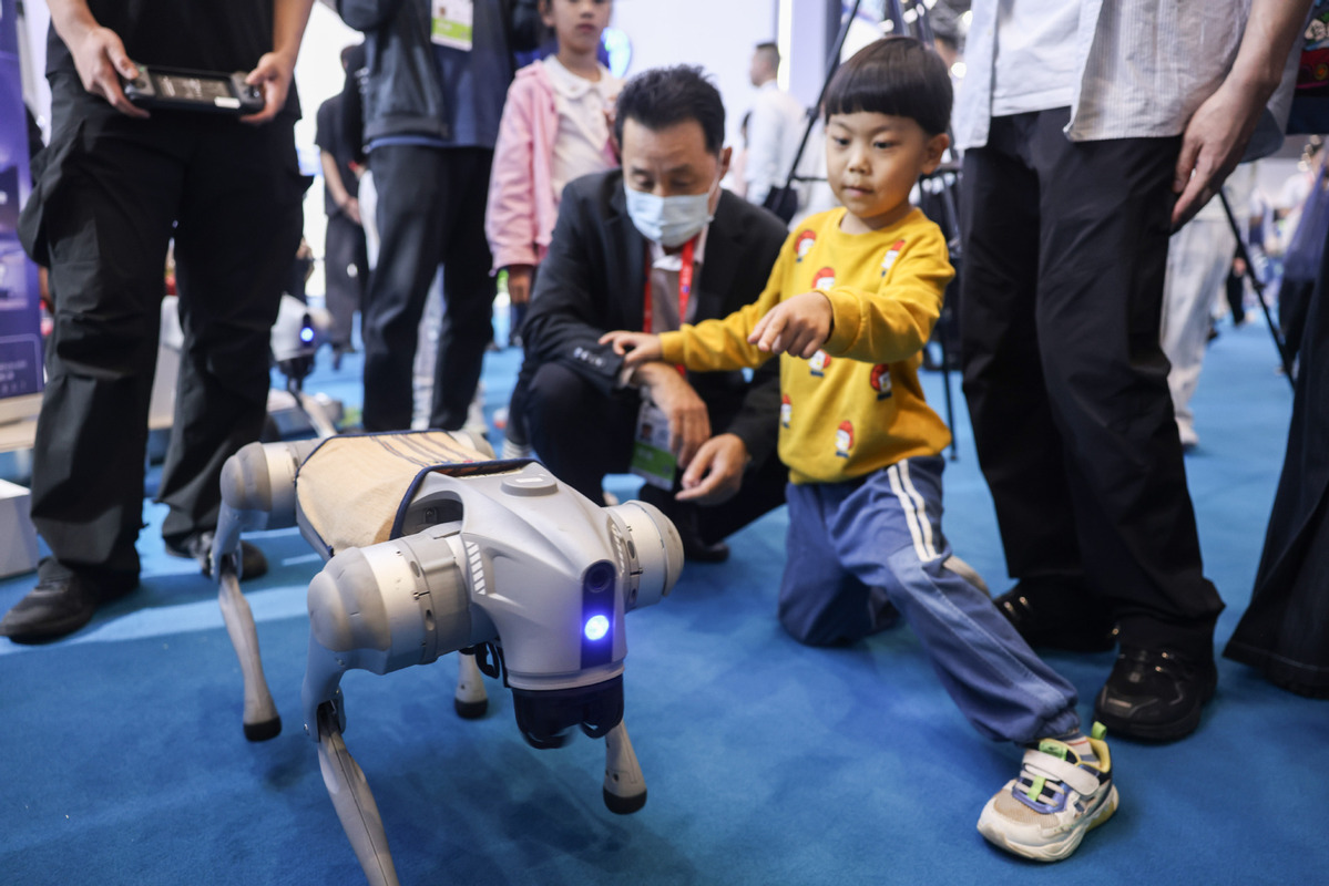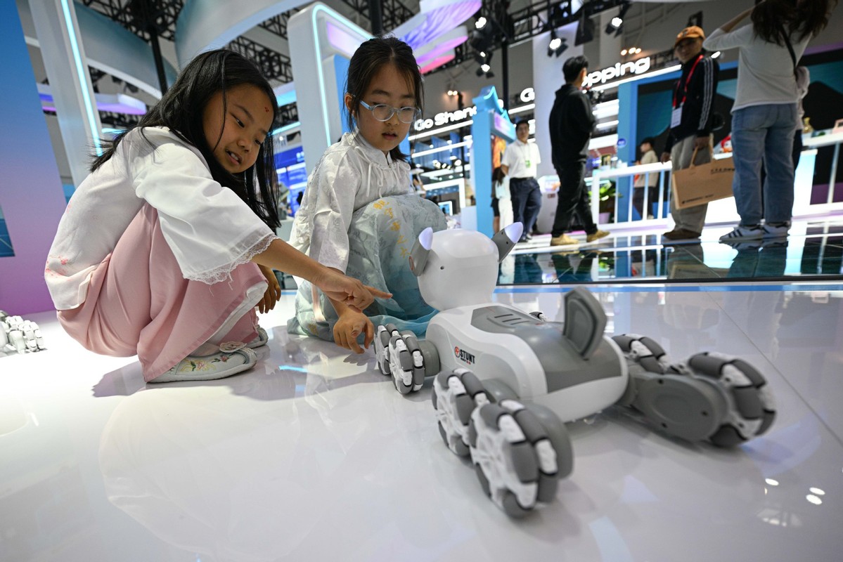 Children play with a robot dog toy at the 5th China International Consumer Products Expo (CICPE) in Haikou, South China's Hainan province, April 13, 2025. The 5th CICPE runs from April 13 to 18 in South China's island province of Hainan. [Photo/Xinhua]