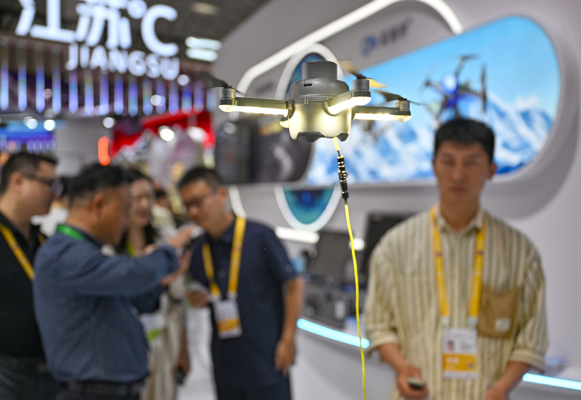 An exhibitor demonstrates a tethered lighting drone at the 5th China International Consumer Products Expo (CICPE) in Haikou, South China's Hainan province, April 13, 2025. [Photo/Xinhua]
