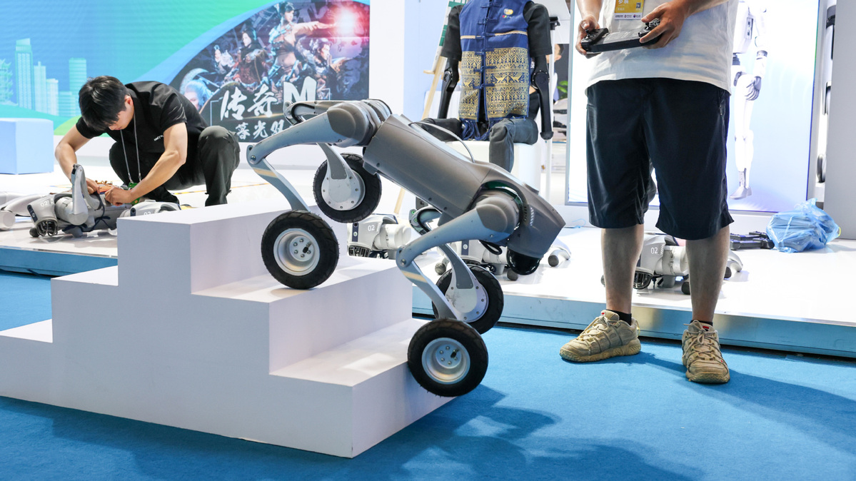 A robot dog displayed by Unitree Robotics is seen climbing steps at the 5th China International Consumer Products Expo (CICPE) in Haikou, South China's Hainan province, April 13, 2025. [Photo/Xinhua]