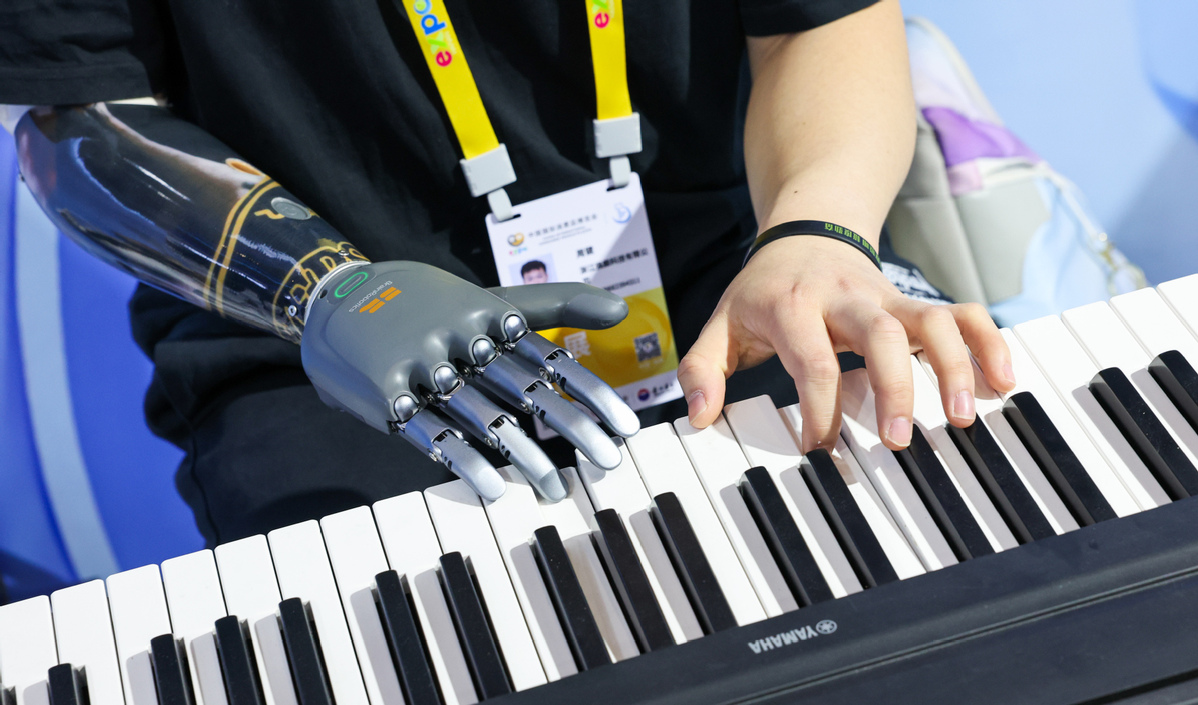 An exhibitor plays piano with a smart prosthetic hand at the 5th China International Consumer Products Expo (CICPE) in Haikou, South China's Hainan province, April 13, 2025. [Photo/Xinhua]
