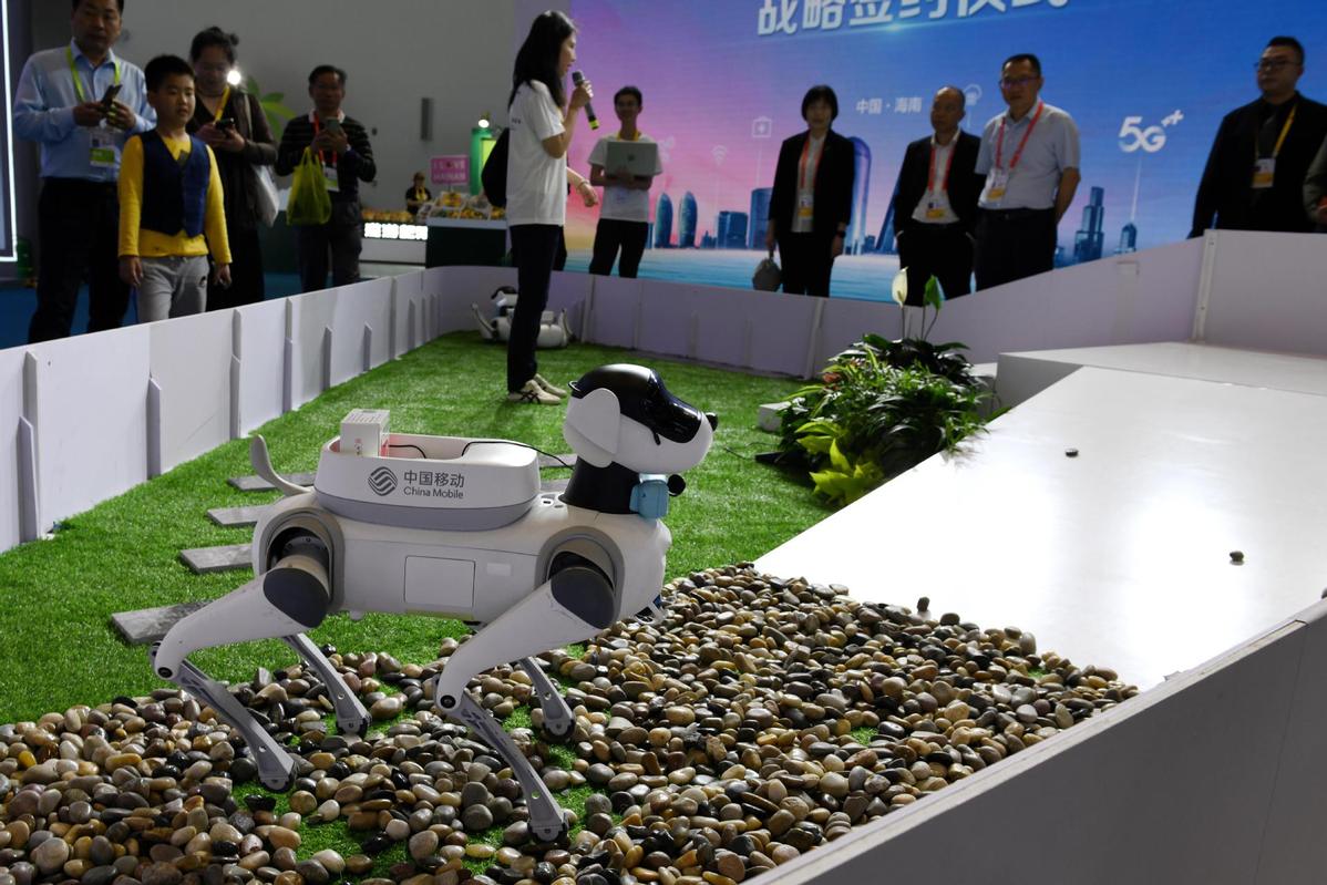 A robot dog is pictured at the booth of China Mobile at the 5th China International Consumer Products Expo (CICPE) in Haikou, South China's Hainan province, April 13, 2025. [Photo/Xinhua]