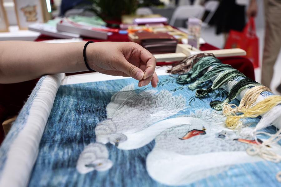 An exhibitor demonstrates Xiang embroidery, a national intangible cultural heritage, at the 5th China International Consumer Products Expo (CICPE) in Haikou, South China's Hainan province, April 15, 2025. [Photo/Xinhua]