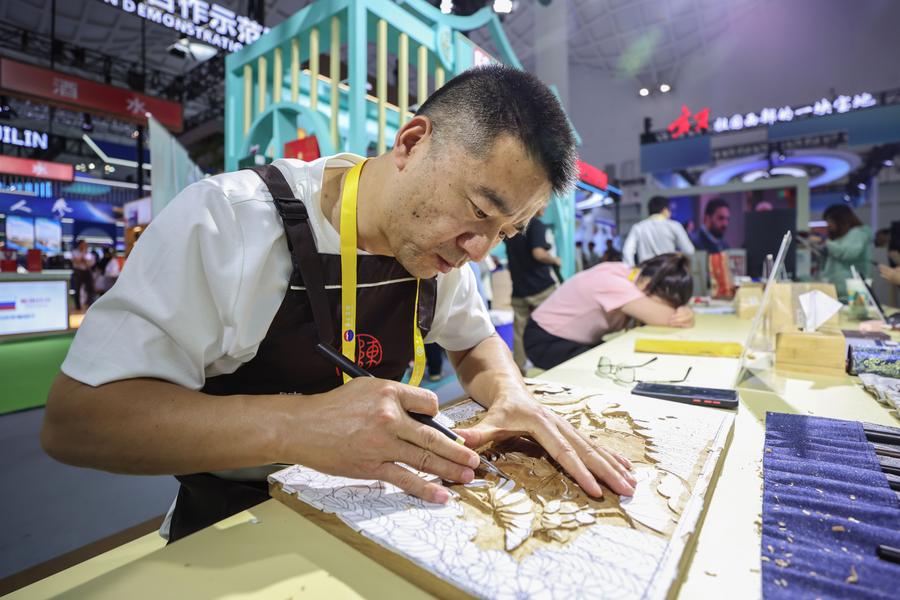 An inheritor of intangible cultural heritage demonstrates Dongyang Wood Carving, a national intangible cultural heritage, at the 5th China International Consumer Products Expo (CICPE) in Haikou, South China's Hainan province, April 15, 2025. [Photo/Xinhua]