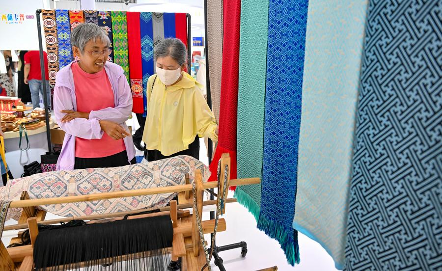 People select products of Xilankapu brocade, a national intangible cultural heritage, at the 5th China International Consumer Products Expo (CICPE) in Haikou, South China's Hainan province, April 15, 2025. [Photo/Xinhua]