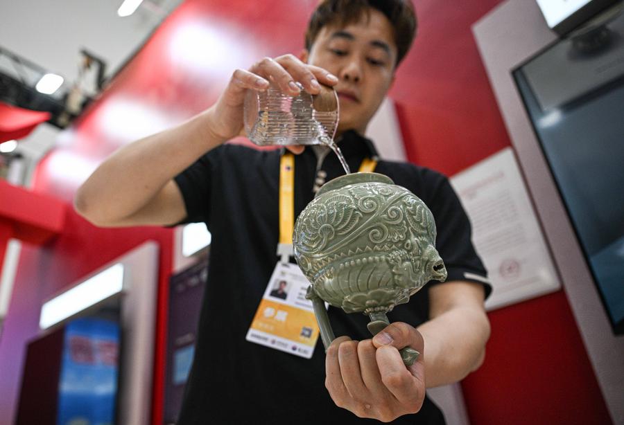 An exhibitor displays a product of Yaozhou kiln ceramics at the 5th China International Consumer Products Expo (CICPE) in Haikou, South China's Hainan province, April 15, 2025. [Photo/Xinhua]