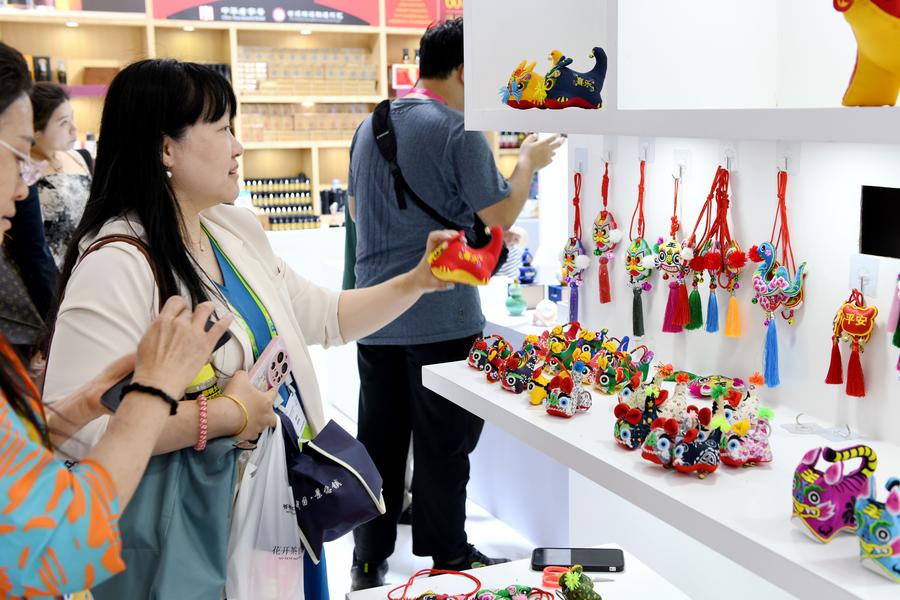 People selects products of Lihou Tiger, a national intangible cultural heritage of north China's Shanxi province, at the 5th China International Consumer Products Expo (CICPE) in Haikou, South China's Hainan province, April 15, 2025. [Photo/Xinhua]