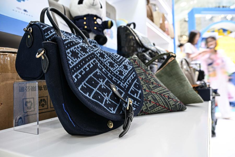 Li brocade handbags are pictured at the Hainan Pavilion at the 5th China International Consumer Products Expo (CICPE) in Haikou, South China's Hainan province, April 15, 2025. [Photo/Xinhua]