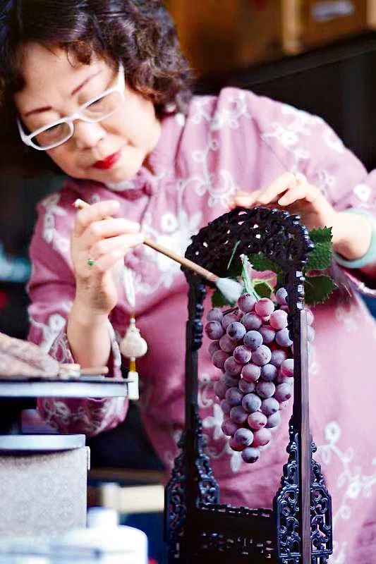 Grapes symbolize happiness, prosperity and good luck in traditional Chinese culture. As such, patterns of grapes have adorned diverse handicrafts since ancient times. Beijing has been renowned for Grape Chang, exquisite glass grapes, during the past century. People are generally surprised to learn the mouth-watering grapes, which appear ripe and ready-to-eat, are made from glass.