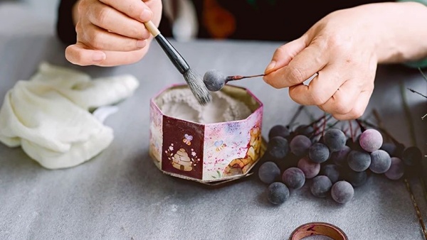 Coloring, waxing and frosting are also essential steps. "It's not easy to color the glass beads. I need to put the beads into burning-hot-liquid wax several times, to color the beads, so they look like real grapes, and to create the texture of the grape's skin. After the beads are dried, naturally, I use fine, smooth incense ashes to frost the grapes. The frosting method is exclusive to our family," Chang Hong says.